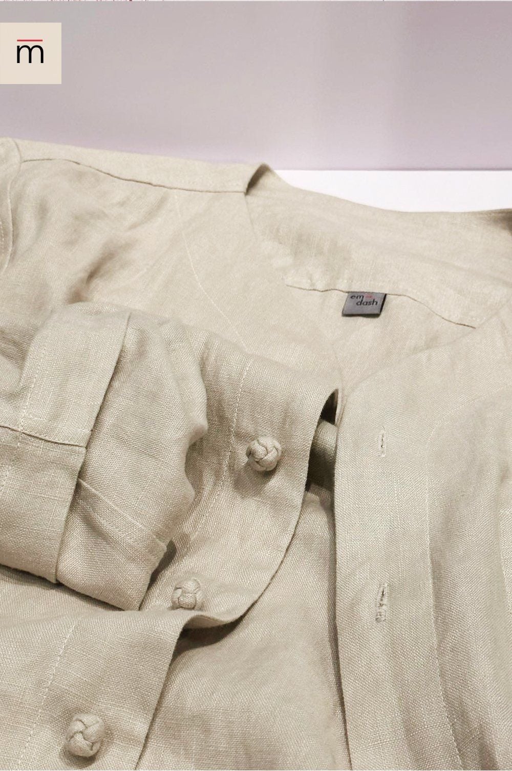 100% linen being stone washed for softness, wrinkle reduction, colorfastness, and shrinkage resistance.