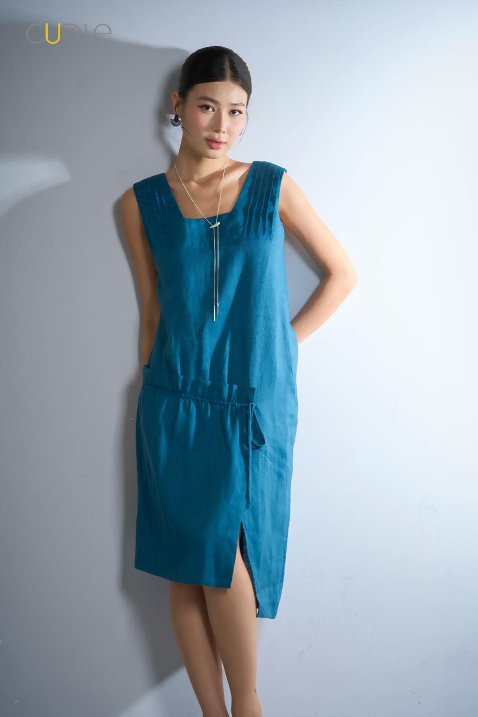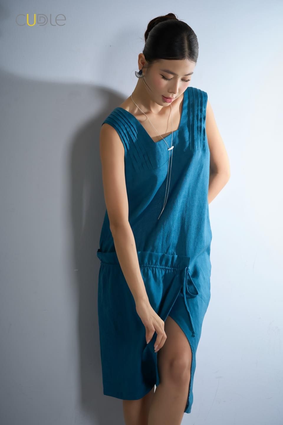 The U-neck with gentle pleats, diagonal hem, suitable for all body shapes.