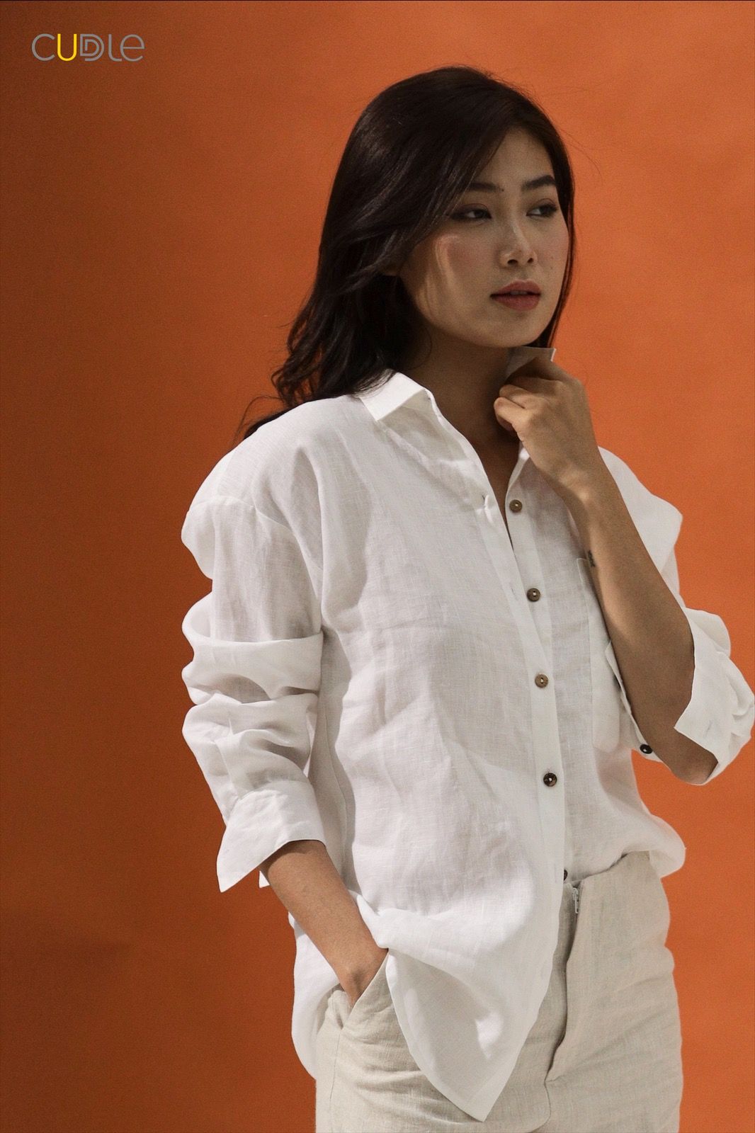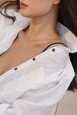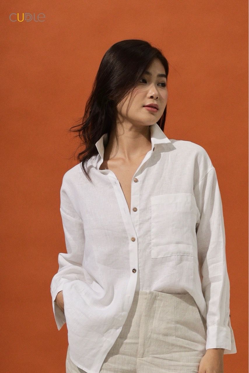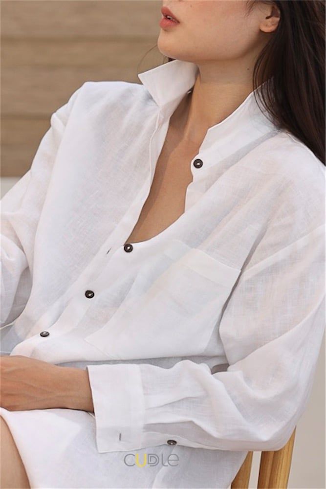 Oversize form. 1 basic pocket on the left. Long sleeves, basic cuffs with rustic coconut wood buttons.